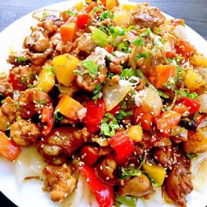 新疆大盘鸡:鸡腿两个斩块,青红辣椒土豆胡萝卜各一到两个,洋葱半个,蒜几瓣姜几片,八角黑胡椒酱油糖适量,铺底的主食可以买烤馕切小块或者面条面片,我用的馄饨皮。