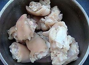 猪手洗净,锅里加水,冷水放入猪手、姜片、八角、料酒,烧开煮出血水后捞出凉水洗净。