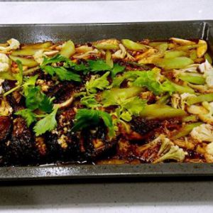 把烤盘直接放在煤气灶上大火煮制,中途撒上烫好的配料。(大概煮制十分钟左右)