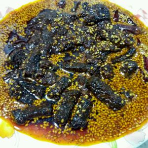 炒料,油锅烧热,加入干辣椒段,辣椒粉,白芝麻炒2分钟。牛肉条下锅,加入盐、糖、花椒粉、鸡精一同翻炒。出锅。