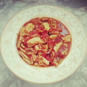 在把先炒好的鸡蛋倒入西红柿里翻炒几下,