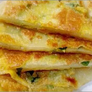 倒一半蛋液均匀铺开,俩分钟后翻一下,另一面用剩下一半蛋液均匀铺开,接着每两分钟翻下面,直到饼鼓起来即可。
