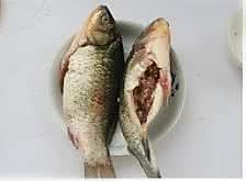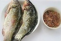 鲫鱼刮鳞去鳃,取出内脏,冲洗干净;猪肉剁馅,葱姜切末,加盐,酱油拌和均匀