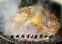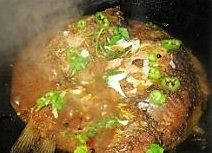 下葱姜末,炒出香味后,再加入料酒、清汤300毫升、酱油、味精、精盐、白糖,随即将煎好的鲫鱼放入锅内,烧沸后改用小火煨焖;