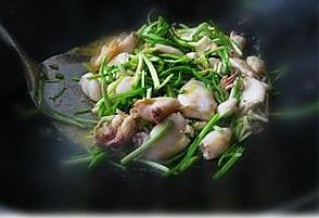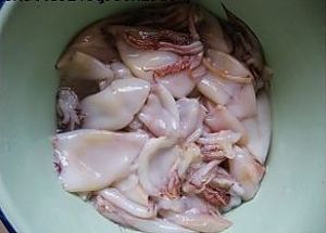 蒜苗洗干净切段。鱿鱼去掉内脏,眼睛和牙齿(就是触角中间的硬骨头),最好把外面的紫膜也撕下去。