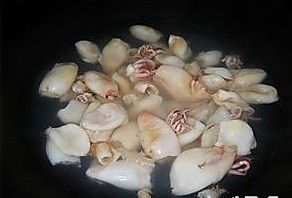 锅里烧开水,把清理好的小鱿鱼倒进去焯那么一两秒就捞出来。焯时间长了鱿鱼肉就老了,不焯炒的时候鱿鱼会出很多水。