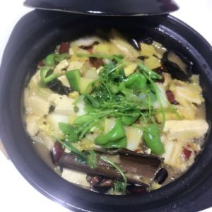 砂锅内放入少许油加热,然后放入葱,姜,干红椒,有蒜可以放些,稍微炒一下,炝锅
