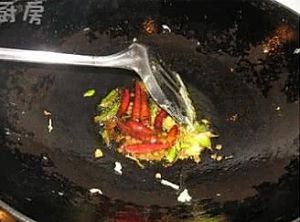 锅里下油,把葱花辣椒和花椒粒放里面炒香,炒到花椒出香味,辣椒变黑红的程度。讲究点的做法是这样的:先小火把花椒粒炒出香味,然后用勺子捞出来,再下葱花和辣椒炒,这样吃的时候就不会咬到花椒粒了。