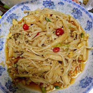 锅里放水烧开后金针菇过水焯一下,时间不要太长哦,变软就要关火的,捞出来过凉水,上面所说的料加进去搅拌就OK啦……