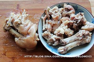 放火上加热,大火烧开打出浮沫,然后转最小火炖煮,猪蹄八成烂时加入适量盐调味;
