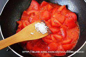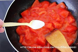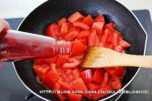 锅里放一点点油,油热后放西红柿入锅翻炒,直到翻炒出汤汁,加入一小勺番茄酱;