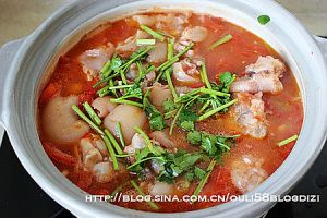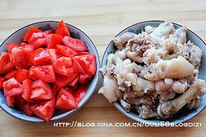 蹄清洗干净(我买的这猪蹄一根毛都没有,挺容易清洗的),用滚热的开水汆烫两次,去除血沫和杂质,以及猪蹄特有的脏腥味,葱姜切片备用,西红柿洗净备用;