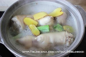 猪蹄放入砂锅中,加温水没过猪蹄,加入葱姜;
