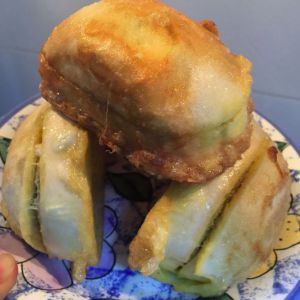 鸡蛋打成蛋液,把刚才夹好臭豆腐的馒头片均匀裹上蛋液。下油锅里炸,炸到两面金黄色,出锅。