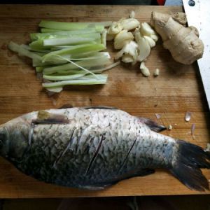 准备材料,一条鲫鱼,身上用刀化几个口子,容易入味,把大葱切葱丝,大蒜头拍扁,切两片姜