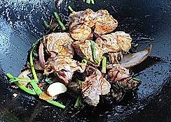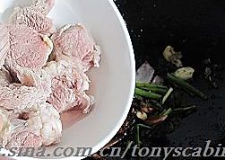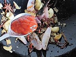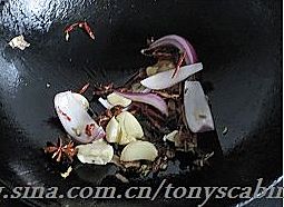 热锅冷油后加入辣椒丝,大蒜,生姜,香叶,陈皮,八角,小茴香,桂皮和洋葱;
