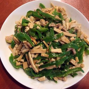 起油锅,煸炒肉丝至变色,加入青椒,加少许水使青椒软一些,加入豆干,放盐,少许糖提味,喜欢位重的可以加一点生抽