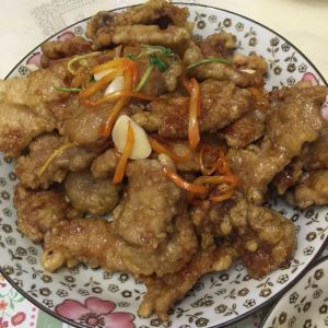 大量倒油(不要担心,剩下的还可以做菜)油锅热至八成,小火下肉。肉片会自己浮起来。看肉片成型,变色便可捞出。捞出用漏勺敲一敲,空出多余油,以免油多,把炸好的肉片变软