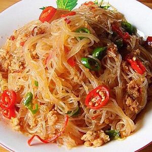 将肉末放入锅中翻炒至变白,加入少量水或高汤,再将粉丝放入翻炒。