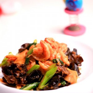锅内做油,煸香葱花、姜末、蒜末,下入鲜虾,炒熟,放盐鸡精调味,放入木耳、冬笋翻炒,最后放入油菜即可出锅。