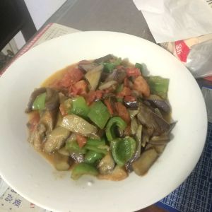 大火约三分钟后加入甜椒,翻炒两分钟并盛起。(这次因为茄子量不大,而且本人对自己厨艺非常自信