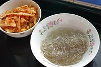 *粉条用热水泡软,或直接煮熟,之后用冷水浸泡一下即刻取出沥干水分。