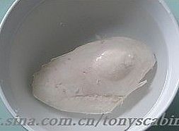 鸡胸肉清洗干净后加入一些料酒和生粉,揉捏5分钟后腌制20分钟;