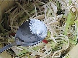 豆芽菜清洗后去根,入滚水焯水10秒钟即可取出放入冰水;把浸泡豆芽的冰水倒掉;