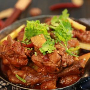 接着下鸡块翻炒,倒入适量的料酒,生抽、老抽、盐和少许的冰糖调味,翻炒几下。