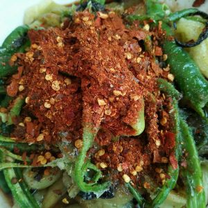 把辣椒和茄子放入火里烧破皮,以至于烧焦皮,然后,放入冷水里,去皮,之后用手撕成一条一条的放入盘子里,辣椒要一样,但是辣椒不去皮,一条一条的斯在盘子里,