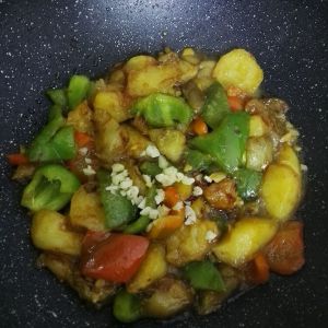 加入土豆,茄子,翻炒。加入少许生抽,老抽,白糖,盐。翻炒。