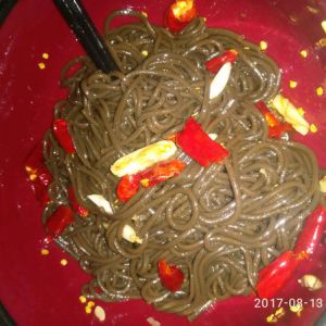 我的是干辣椒,所以先搞碎了,加入醋,酱油,鸡精,香油,糖,辣鲜露泡一会。