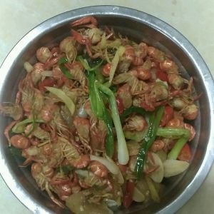 另起锅,加除葱外的佐料,炒香,放虾炒片刻。