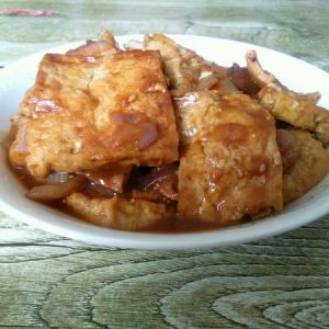 放入煎好的豆腐,放入两勺黄豆酱,一勺半蚝油,生抽一勺半