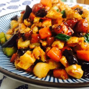 将鸡丁、胡萝卜丁、花生米、黄瓜丁、葱段下入锅中大火翻炒一分钟,调匀并倒入酱汁,翻炒