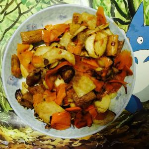 葱姜蒜爆香,逐步放进五花肉,胡萝卜,茭白