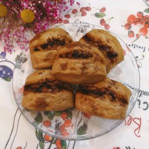 发酵完后拿出面团,硅胶垫上撒一些中粉,面团擀平。卷起,成长条。