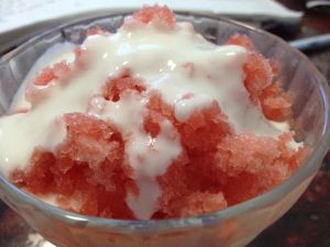 待到冻成饼,用钢勺刮动成沙冰,放入刨冰盘