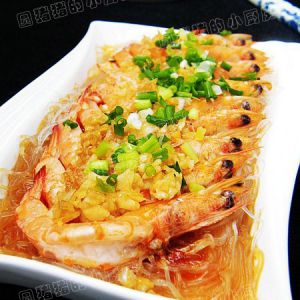 鲜虾挑去虾线,在背部开一刀备用,蒜蓉,香葱碎,粉丝50克(提前用凉水泡发3个小时)
