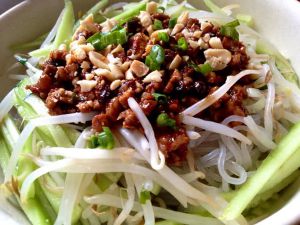 待面条煮熟,捞出放入碗里,豆芽水滚水快速焯过,黄瓜切丝,花生米用菜刀的一面将其压碎(注意安全)将材料都摆到粉丝上面,开拌!