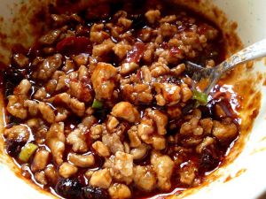 肉丁我昨晚用酱油,鸡精,老酒,胡椒粉,辣椒粉,还有生粉给腌制了,只要热油炒过稍微加些水焖熟就好,然后融入之前调好的酱当中