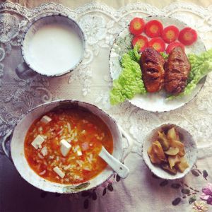 将生菜和胡萝卜进行摆盘装饰,放上做好的鸡翅。搭配酸汤放、榨菜和酸奶一起食用。