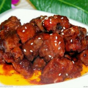 原锅留油少许,放入葱段爆香后捞去,即将排骨下锅,迅速将调好的芡汁放入锅中,连续翻炒,淋下香油即可。