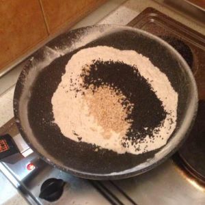 翻炒到微微变色,加入五仁继续翻炒,之后加入黑芝麻。