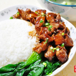 米饭盛在碗里倒扣在盘子一边,码上小青菜, 浇盖上里脊肉即可