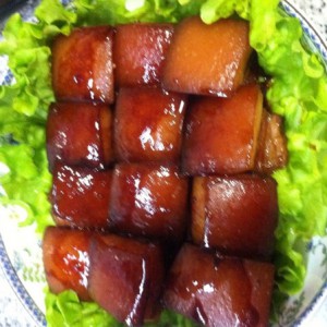 肉煨至将熟时将肉块翻转,皮向上继续收汁使瘦肉部分入味。其间取空盘用生菜打底备用
