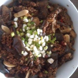 下肉末炒散至变色,放入葱丝,下茄条煸炒;放入青辣椒块翻炒,加盐,鸡精