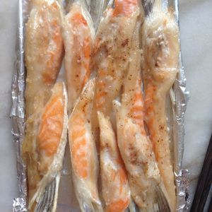 垫好锡纸,把鱼腩码上,撒上刚碾碎的细海盐