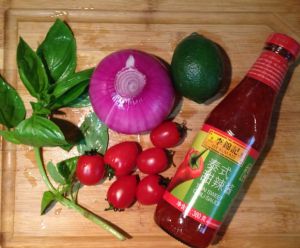 將聖女果一切兩半,洋蔥切絲,摘下大小適合的九層塔葉備用。