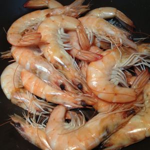我今天用的是新鮮的海白蝦,先煮熟,加一點料酒。